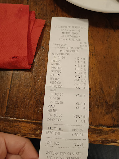 Super delicious simple Home made Food. We were there for lunch with the Menu of the day. 3choices as Starters, 3 Choices as Main and 5 Choices as desert, with good Rioja wine. Water and Café included in the Menu. As i am vegetarian , the Waitress was really helpful, she accomodate some dish in the Menu for me . Service was super friendly, we came with our 3 suitcases before to leave to the Airport and she made all possible for us to leave them in a corner Even in there was very small Place available and the Restaurant was Full! I can only Highlight recommend it as best value Quality spanisch homemade Food! Our desert a Carott cake was as well Stuning! Thank you for our last spanish Taste before to Go back...