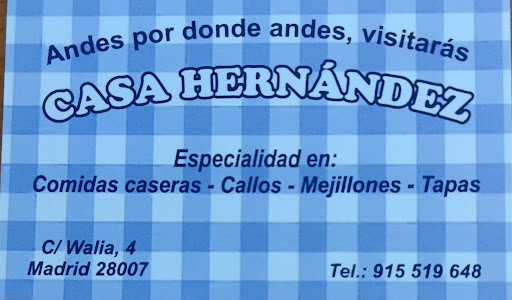 En esta ocasión nos hemos ido a comer a CASA HERNÁNDEZ en la calle Walia 4 de Madrid, junto a la plaza de Conde de Casal y la calle Doctor Esquerdo.