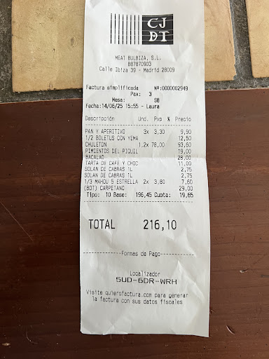 Read moreI’m not the biggest fan of these very traditional restaurants, but even then I found this one disappointing. The chuleton was acceptable, a bit hard and chewy but decent flavor. It is very strange that they bring it to you pre plated and cut into pieces, but even stranger that the pieces feel torn randomly instead of carefully cut. Their a la carte menu is very simple and boring and has nothing that is elaborated or has interesting flavor. They have vegetables, cod, chistorra sausage and chuleton. The cod was bland and it came with pretty good peppers, the peppers were the best part of the meal. Their wine list is very overpriced when compared to other restaurants in Madrid. They had a good variety of desserts. The pastel Vasco was not bad, but the rice pudding was very bland. Overall I would recommend they add a few items for people who like flavorful food and maybe a...