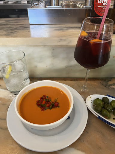 The food was fabulous and the staff were all super friendly and attentive. I sat at the bar and the bartender explained the menu. He spoke great English (which I don’t expect, but always nice when they try to help when you’re not a native Spanish speaker), and served the first course as soon as I was ready. It was gazpacho with little peppers (not spicy), which was very refreshing. Following that, I chose the main fish course, which was exquisite. Everything was light but flavorful!