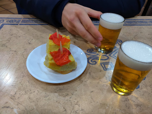Love this neighborhood spot that's apparently historical but also has a modern feel. Relatively calm on weekdays but totally packed on weekends, with people spilling out onto the sidewalk outside. Free tapas with your extremely reasonably priced caña - a small bit of torreznos, or maybe some tortilla on bread. They're known for their torreznos, which are ridiculously crunchy, almost to a fault. As of June 22, they have not reopened after the lockdown. Hope they...