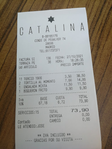 Read moreI had a wonderful experience at Catalina apart from the wonderful service provided, the food and the ambiance was immaculate. Had to come a second time before leaving to my home country. Absolutely enchanted by the flavors but most of all the servers, sindy and jhony made our time even better. I recommend the patatas bravas, alcachofas, burrata, croquetas and lastly...