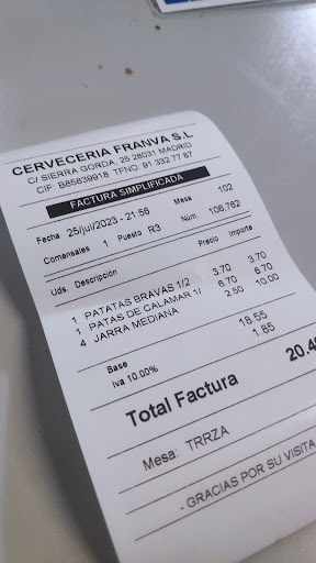 Read moreLe doy menos cinco estrellas al que dice ser encargado de Franva.Vamos a comer hoy domingo a las 13.30h, ya que no se dan reservas para celebrar el cumpleañosde una niña de 7 años. Mesa de 16 personas, que les habrá dejado su dinerito, con personas mayores, que no podíamos cambiarlas de lugar. Por eso nos hemos quedado, si no, por dignidad y dado el trato recibido por el que dice ser encargado, el más mayor, calvo, nos hubieramos ido. Hemos recibido un trato inaceptable y grosero. No quería darnos mesa en la terraza a pesar de ser aún la 13.30 y de haber mesas. Había mesas, que nos decían a nosotros que se iban ya para que nos sentaramos. No lo ha consentido, todo con muy malas formas.. Tanto él como la dueña son conocedores de que iba a escribir esta reseña porque saben cual ha sido nuestro malestar. Mientras que tengan a esta persona de cara a los clientes, que somos los que les dan de comer no lo recomiendo en absoluto. Espero que esta reseña sirva para que la dueña, que ha sido muy amable con nosotros, sea consciente de la persona que tiene de cara al público....