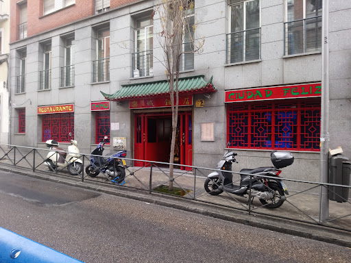 En la calle Fernández de los Ríos nos encontramos con uno de los restaurantes más antiguos del barrio de Chamberi: CIUDAD FELIZ. El decorado de este restaurante es lujoso, con mesas vestidas en manteleria vino tinto en su fondo y blanco en su superficie. La sillería vestida, combina con las mismas telas de los manteles. El suelo es de madera clara, que armoniza en sus colores con las paredes tapizadas en rosa. También encontramos basamentos en madera talladas y adornadas con claraboyas doradas en dichas paredes. Los techos están pintados en blanco con bóvedas pintadas con motivos decorativos chinos tradicionales muy llamativos. Con este suntuoso y elegante ambiente, hemos pedido ROLLITO DE PRIMAVERA, con su REPOLLO, ZANAHORIA, TERNERA Y LECHUGA. La propuesta ha estado bien a la altura. Seguidamente, una SOPA DE FIDEOS CHINOS CON TSA-CHAI (PICANTE)... con una base de caldo de pollo espesado generosamente con HARINA DE ARROZ y ADEREZADO CON SALSA DE OSTRAS, GLUTAMATO, NABO CHINO Y PIMIENTA BLANCA en buena proporción, lo cual hace de esta sopa una propuesta interesante.