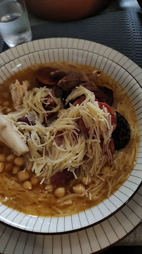 This restaurant has an authentic vibe. No over the top decoration and not overpriced like the ones in the center. Simply a local neighborhood restaurant. As a snack they bring a small plate of spicy pickled peppers while you wait for your food. The speciality here is of course the Cocido which is made with an artistic devotion and served in a grand way (depending on the number of people sharing it. We were 5). First, they bring a huge terracotta pot with the broth, then a huge dish with the meats and a small one with the vegetables. There is free refill for everything, but in our experience it was already difficult to finish our portion 😅. Once everything is on the table, the waiter explains in great detail the origin of each ingredient: chicken, Panceta, ham and different types of Chorizo, Morcillaa and chickpeas each coming from a different part of Spain. The taste confirmed that everything was of extremely high quality. Finally, each person is free to serve himself as he pleases and enjoy the food.