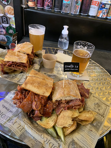 El restaurante Craft19, ubicado en el mercado de Vallehermoso, tiene varias cosas buenas. El ambiente del mercado es muy animado, con mucho ruido, pero si te gusta ese tipo de energía, puede ser muy agradable. Craft19 está especializado en bocadillos de pastrami y cervezas artesanas, aunque también ofrecen hamburguesas. El bocadillo de pastrami que probamos estaba muy rico y el servicio fue increíblemente rápido. Éramos tres personas, y en menos de cinco minutos ya teníamos mi hamburguesa y los dos bocadillos de pastrami que pidieron mis amigos. Hasta ahí, todo genial.