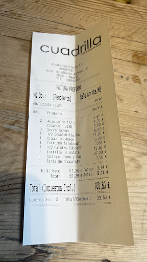 Read moreIt seems like a very good restaurant. I entered at 16:35, i saw that there were two or three people drinking and eating. I was wearing a casual sport costume and as i entered and asked for a table they started speaking in spanish ( i do not know spanish) and they told me the kitchen was closed and showed me the exit. There was no card there writing that the kitchen was closed and they were serving as i entered. Im giving 3 stars just because the place looked good and it is my first visit in Madrid. Anyway feeled very disrespected as i just wanted to grab a meal, a big...