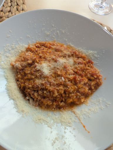 El risotto ya me daba mala espina por la forma de pegote que tenía (dejo foto) aunque no olía nada mal, y cuando lo pruebo noto el grano duro, no al dente, duro como un peñote. En la carta no especificaba si era meloso, y ahora se el motivo. Devuelto a la cocina! No he querido ni que lo repitieran.