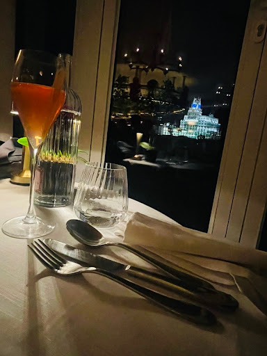 The place is beautifully furnished, and the ambiance is chilled-out, warm, and cozy but still elegant and classy; and because of its layout you get to be near a window basically from every single table, which is probably one of the main attractions of the restaurant: the spectacular views of downtown Madrid you get to have!!!
