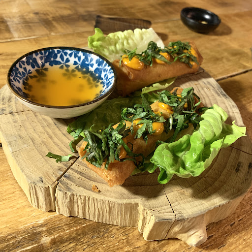 Entrantes 📷 rollito de cangrejo y verduras con salsa se jengibre y lima . 📷 bao de Butifarra ,hosin y pepino holandés 📷 gyozas de langostinos,panceta y shitake 📷 dim sum de rabo de toro y huevo se codorniz y el y edemame y kimchi sobre .