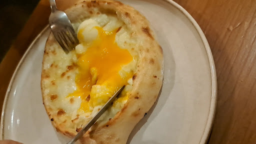 We visited on an impromptu Sunday and despite all the tables being reserved the barman went out of his way to squeeze us in. He was cheerful and welcoming, offered to explain the menu to us and put up with our infuriatingly bad Spanish so we could get in some practise. We ordered some mushroom pkhali and they were heavenly, along with an aubergine dish and some dips both served with fried bready dumplings I could eat by the bucket load. The cheesy bread with egg came up last and it was everything you’d envision it to be. Unfortunately I was already stuffed and we’d just finished our carafe of a delicious red so we boxed it up to take home. There will be a return visit to try out the rest of the menu and I will defiantly be reordering the mushroom pkhali.