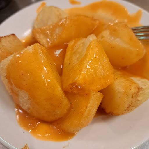 The patatas bravas are underwhelming.. it's nice that it's actually a bit spicy (for Madrid standards) but for a item that's bold on the menu the dish doesn't live up to it. Not the best in even in the neighborhood. One note in texture, like frozen potato that's deep fried and heated up would be.. missing a...
