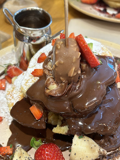 Terrible service. The waiter was good but the waitress is so rude and unfriendly. We waited a lot of time for our order to be taken, approximately 15 minutes and we waited OVER AN HOUR for our food to come. The drinks were okay but the food was bad. The pancakes are too think and dry and the chocolate was so gross it made me nauseous. The only thing good about the pancakes was the jam that came on the pavlova pancakes. The reason we waited over an hour was because the waitress sent all the orders to the kitchen except for our order. The waiter apologized even though it was the waitress’s fault. The waitress even dropped a glass because she was playing with it by sliding it around the counter. She dropped the glass and it shattered right next to us because the counter was next to us. The floor was covered in shards and one of them even got on my pants. No one was hurt but the waiter again apologized and offered free drinks and the waitress did nothing about it. She did clean the glass and the waiter apologized even though he wasn’t the one who made the mess. It’s a tourist trap and it’s not worth walking to it. It’s so far from the main city and more in the local neighborhood yet many tourists go there. A group of six came and they waited half an hour to be seated. It’s a pretty big tourist trap and it’s too expensive for what it is. It doesn’t even deserve the 4.7 star rating. The waiter was nice but the waitress is so unbelievably rude. Don’t waste your time and energy walking to this place because even fast food breakfast is better than this. If you look closely in the pictures, you can see the glass shards on the ground. Not...