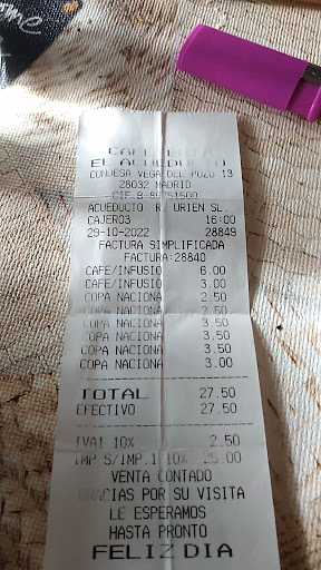 Read moreUn robo a mano armada. Si seis cafés entre ellos una manzanilla a 3€ y seis copas de licor dos de ellas sin alcohol 28€ es un robo. Estamos hablando de un bar no un restaurante de lujo y encima en Vicálvaro no en la puerta del Sol o la moraleja. Con un trato un poco escaso porque nos levantamos mucho a por las cosas nosotros. Y si hablamos de la comida 115€ por 8 cachos d cosillas de 3 - 4 costillas como mucho un plato de ibéricos que salvo dos productos los demás no lo eran y una ensalada con lechuga iceberg que es la más barata porque lo demás no se veía y encima era lo equivalente a un plato sopero y eramos 6 personas. Botella y media de vino de la casa, tres caseras y dos cañas que cobraron y solo pusieron una. Ahora juzgar sino es un robo. Por cierto tengo el ticket...