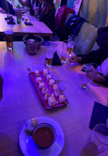 Siempre pruebo nuevos restaurantes en el tenedor y aprovecho los descuentos, si me gusta mucho el restaurante me tienen para siempre. Pero es que nunca me había pasado lo que me pasó con este restaurante. La carta del restaurante no la tienen actualizada, el primer chico que nos entregó la carta simplemente nos dijo que era el qr que estaban actualizándolo, al momento de pedir comida no tenían ni menos de la mitad de la carta. Las entradas estuvieron bastante bien, pedimos tabla de quesos, croquetas, patatas bravas. Muy rico los entrantes pero 30 minutos para que traigan cada plato deja un poco que desear. Las bebidas si las traen bastante rápido. Cuando pedimos la comida que fueron 5 hamburguesas, al ver que en carta tenían opción vegana(teníamos acompañante vegetariana) fue una buena opción escoger este restaurante o al menos eso pensábamos, en carta aparece una pulled pork vegana (no la tienen) el camarero un poco chulesco hace un comentario de que le trae pan, lechuga y tomate (un poco falta de respeto para mi gusto) hay que respetar los distintos gustos de los comensales y más si en su propia carta tienen opciones veganas; al final le trajeron una hamburguesa vegana pero no pulled pork ya que no tenían, bastante seca y sosa sin ningún tipo de salsa, no la recomiendo. La pulled pork estaban buenas. La hamburguesa de pollo (que no sé cómo se llama porque el camarero simplemente dijo que tenia pulled pork, carne y pollo) estaba demasiado salada no me la pude comer entera, se la termino de comer un acompañante y a medias. Los tiempos de cocina bastante mal otros 30 minutos para las hamburguesas, todos los acompañantes de las hamburguesas estaban fríos que eran las patatas. De postre, aprovechando que tenia dos acompañantes de cumpleaños pedí brownie con helado y tarta queso. El brownie estaba bastante bueno, el helado estaba malísimo como si fuese de supermercado tipo alcampo (fatal). La tarta de queso no fue mi favorita tampoco. Los postres no incluían el descuento de el tenedor (no entendí por qué razón si al reservar solo aparece menús y bebidas no incluidas en el descuento) tienen que arreglar eso porque engañan un poco al cliente. Al final el camarero quizo ser un poco majo y nos quería entregar chupitos, pero si seriamente no quisimos y ya nos queríamos ir. Volvió a acercarse a ofrecernos chupitos de mojito sin alcohol y los aceptamos. El lugar está bastante chulo, pero la atención deja bastante que desear, cuando la comida está bastante buena contrarresta el tema de la atención pero en este caso tampoco fue así, comida fría, atención mala y comentarios de mal gusto. Lo siento, pero no me fidelizaron ni a mi ni a mis 4 acompañantes, menos mal era con 50% de descuento porque para el precio real por lo menos las hamburguesas no lo valen, como recomendación pongan camareros majos, controlen tiempos de cocina y tengas una carta aunque sea física ya actualizada mientras están...