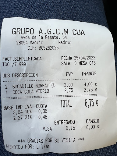 Read moreEs un ABUSO lo que hacen en este local para cobrarte mas dinero. Alguien que por favor me explique como es posible que una coca-cola de lata de 330ml cueste 2.75eur en un local como este (y luego ponen en el ticket “Coca-Cola Vidrio”)? Mientras te cobran un bocadillo por 2eur? Evidentemente te dicen que tienen una promoción del bocata pero luego pides una bebida y te cobran esta BARBARIDAD. Habíamos ido antes a comer allí (en las mesas, no para llevar.. que ahora dicen que es sólo para llevar) y la promoción costaba 2.75 eur el bocata + la cocacola, ahora solo la cocacola te la cobran a ese precio.. una locura de verdad.. Es muy triste que hagan esto, ya que el trato de las chicas que atienden y la calidad de los productos es buena. Pero al ver que te hacen esto al cobrarte hace que no quieras volver, muy...