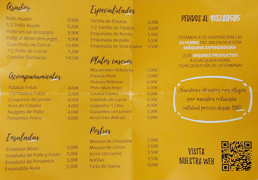 Read moreHay ofertas que se adaptan a todos los gustos y para cualquier número de personas. He ido varias veces a encargar y recoger mi pollo asado, pero veo que tienen otros productos que se ven deliciosos. La última vez que estuve, hace cuatro días, me atendió una señorita joven que me explico la diferencia entre el pollo normal de asar y el de corral....y no solo por los tres euros que costaba más. Si no me equivoco a partir de ahora llevare el de corral por qué la señorita tenía toda la razón en cuanto a calidad y sabor....que siga aconsejando así a los clientes que seguro se lo agradeceremos todos por su simpatía y sinceridad. No obstante me dijo llevaba muchos años allí entre pollos. Un sitio muy...
