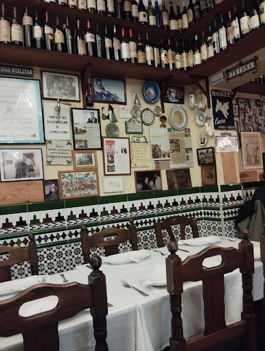 Tras un par de visitas a la barra me decido a quedar para comer en esta taberna de barrio y la verdad es que me ha dejado bastante frío este sitio. El local, tabernilla de ambiente andaluz es muy ruidoso y me pareció incomodo, tanto la barra que siempre esta petada, como la zona destinada a mesas, muy bajas, demasiado juntas y con unas sillas incomodisimas. Ademas nos toco el "mejor" sitio. Al lado justo de la puerta del WC (donde por cierto entraba y salía sin parar un Sr. con comida y bebida. Se ve que debe haber algún salón privado al que se accede por la misma puerta del Vater..... inaudito). En fin.....Para dos personas pedimos: Tortillitas de camarones (2). Buenas. De hecho, para ser Madrid muy buenas. Croquetas de jamón (6). Especialidad de la casa. Muy ricas, con una bechamel muy cremosa pero sin llegar a ser liquida. Si no hubiesen tenido un ligero regusto a avecrem me habrían parecido casi perfectas. Callos con garbanzos. Ración escasa. Muy flojos. Tanto las carnes, gomosas, como los garbanzos de pedrosillano, tirando a duros. Un plato demasiado fuerte de sabor que para mi que llevaba mas de tres días descansando en la nevera. Ensalada de tomate con pimientos y ventresca. Fail total. Tomate de invierno barato, insulso y sin salar, una mínima lamina de pimiento de bote y un poco de ventresca remataban este plato totalmente falto del mas mínimo cariño. Este condumio regado con dos dobles (bien tirados, todo hay que decirlo) y dos cafés, dejan la cuenta en 58,80 E, para mi un precio a todas luces excesivo para la experiencia general. Mención especial para el servicio. A medio camino entre borde y/o obtuso, sin que pueda especificar en que extremo de los dos. Lo dejo exclusivamente como visita de barra y le doy 3 estrellas. Ahora con el COVID ni se me ocurriría entrar aquí. Como diría un bobín actual,...
