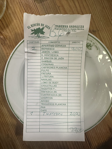 I ordered the "Rincón de Jaén" salad with marinated fish and three medium beers. All good, I paid €31 in total (€14 for the salad + 3 beers).