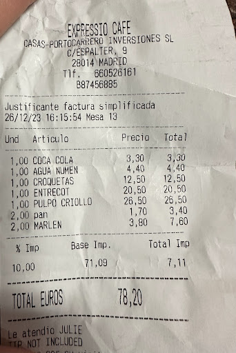 Read moreLo que pasa cuando no se leen las criticas y un sitio que no las aceptan y si no con leer las respuestas que da la dueña se ve el retrato de como solo se piensa mal y se amenaza a quien cuenta su experiencia. Siempre hemos cenado cuando vamos por la zona en el local de al lado, Moreto 17, pero esa noche no fue posible y pasamos a este local contiguo, entramos en el interior y lo primero que vimos fue una mujer que a voces les decia a una pareja que a fuera no se iban a sentar y que era solo para cena aunque habia mesas vacias. Luego salio un señor y les dice que no les va a servir cafes que son restaurante. A esto la mujer nos dijo que la terraza era para cenar no beber y eso fue solo el principio. A una pareja que se iba a sentar les dijeron literalmente que fuera de la mesa porque no les iban a servir bebidas. Pedimos cerveza grandes y nos sirvieron unas copas que eran cañas y de los platos mejor no hablar. Tardaron en salir, frios y para el precio cantidad escasa. La carrillera seca con una triste hoja de lechuga para llenar el plato y un pure sin sabor alguno. El salmon minusculo y seco tambien, con mas lechuga para llenar el plato con una salsa sin sabor alguno. A todo esto la encargada a voces por cualquier motivo enfadada y desde luego asi consigue que el volver entre la poca calidad de la comida, los altos precios y el mal humor suyo sea imposible como se puede leer en las opiniones, que no leimos y nos hubiese evitado la mala leche con la que nos fuimos por supuesto sin ganas de postre. Ahora nos imaginamos su respuesta pero las malas formas de esa señora que debe estar enfadada con el mundo son objeto de la mayoria de las opiniones al igual que las criticas que deben de servir para mejorar y no para defender lo indefendible pues solo con sentarse en la terraza el espectaculo esta...