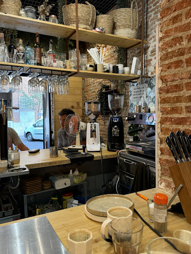 Read moreLocal de dos ambientes semi abierto agradable con ventanales y una barra delante, comedor pequeño en medio y cocina detrás. Decoración con ladrillo visto y soluciones prácticas rápidas para acabamientos, objetos de cerámica y kitsch en algunas paredes y estantería. Mi silla de trazos era cómoda y en general todo limpio. Le quito un punto por concordancia y exceso de “practicidad” sobre acabamiento cuidado. Café este día colombiano “La Noria” intuyo que tueste medio-ligero con sabor claramente fermentado hacia tal vez whiskey, acidez ligera limón y final tostado ligero tal vez hacia la malta. Muy rico y siendo doble bien hecho pero con algo de poso grueso. Pedí la Feca Toast, que da nombre al local. Huevo frito con puntas doradas y cortes de algún tipo de jamón salado por encima que ellos llaman serrano, sobre aguacate en láminas, todo sobre tomate triturado rehogado con orégano. El pan tostado queda húmedo por el centro por el tomate y se le agrega un chorro de aceite balsámico reducido por encima y finaliza con pimentón dulce. Muy rico y en su punto de sal, mejora aún más con el aceite picante que tienen en la mesa de autoservicio de agua y sazonadores. Le quito un punto a la comida por lo difícil de partir que es la corteza. El agua del puesto de autoservicio tiene sabor a filtrada, está fresquita pero no fría y los vasos están limpios. Le quito un punto a ambiente por la música venir de un aparatito pequeño en un lateral colocado sobre las mesas de la entrada, las que iba a coger inicialmente, bloqueándolas. Servicio muy sonriente pero...