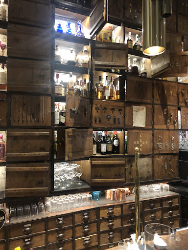 Success, he can in fact see and hear me. He barely understands what I'm saying, our languages criss cross like all those multiple glasses on the bar. He then goes back behind the curtain, all the better to ensure that those boxes he broke were still broken.