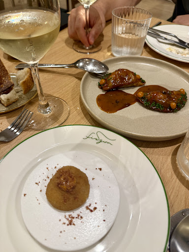 Tuvimos la suerte de descubrir este restaurante donde cada plato es una pequeña obra de arte con identidad propia. Empezamos con las cuatro tapas principales que definen muy bien la personalidad de la casa: -La ensaladilla “abrandada” de gamba blanca fue, sin duda, la estrella. Cremosa, potente y equilibrada, con un sabor a mar que te atrapa desde el primer bocado. -Los huevos gilderos fueron un guiño sabroso y divertido, con ese toque ácido y salino que despierta el apetito. -La empanadilla de callos sorprende: crujiente por fuera, melosa por dentro, con un guiso tradicional llevado a otro nivel. -Las croquetas a la castellana fueron un homenaje al sabor profundo, con un rebozado perfecto y un interior de sabor auténtico.