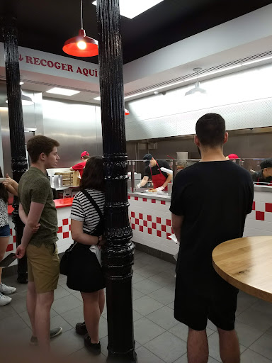 Read moreCadena americana recientemente llegada a España con una pequeña carta de hamburguesas, perritos y sándwiches donde las primeras son las estrellas del local. Puedes elegir entre hamburguesa simple, con queso, con bacon o ambas, todas ellas con una o dos carnes y después añadir gratuitamente los extras que quieras entre una selección de 10 ingredientes (cebolla, tomate, lechuga, pimiento, jalapeño, etc) y 5 salsas (ketchup, mostaza, bbq, etc). La carne tiene buen sabor y los ingredientes son frescos y están ricos, en general es una buena hamburguesa, pero el tamaño es pequeño para su precio. Las patatas fritas también están buenas, estilo five guys o cajún, cortadas en el momento y fritas en aceite de cacahuete. Las hay en tres tamaños pero de nuevo un precio alto para la cantidad. Si pides refrescos hay máquinas para rellenar las veces que quieras y puedes elegir entre 100 sabores distintos haciendo mezclas de refrescos (cocacola, fants, sprit, etc,) y sabores (mora, lima, uva, fresa, etc). También hay disponibles cacahuetes y bandejitas de cartón para que comas todos los que quieras de forma gratuita. Tienen sobres y dispensadores de ketchup y mahonesa para que te eches al gusto y también botellas de vinagre. Por último también tienen una selección de batidos con muchos sabores distintos a los que puedes añadir...bacon... El servicio del personal excelente, muy atentos y agradables En general buenas hamburguesas y buen sitio de comida rápida pero en mi opinión a un precio muy elevado para lo que ofrecen ya que entran en un rango de precios donde encuentras competidores que las superan...