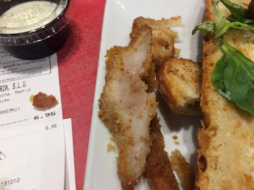 My friend ordered a sandwich with breaded chicken on it, and I ordered a breakfast sandwich in a meal deal with a drink. The chicken in her sandwich was UNDER COOKED! My bread was rock hard and made a distinct clang noise against the plate because it was so old. My drink was just brown water. Nobody there spoke English, which is fine since Spain is not an English speaking country, but it made the idea of complaining seem impossible. Go anywhere else. This place is...