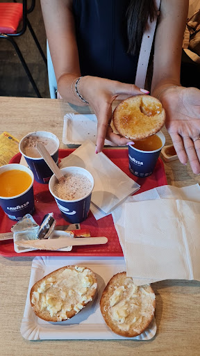 Read moreAunque la bollería y el café está bien, la atención pésima. Pedí un café con leche templado para llevar y me dio uno ardiendo, del punto que quemaba solo coger el vaso de cartón y cuando le digo que está muy caliente me grita y dice que es que cada uno tiene un punto, cuando había visto que le había echado toda la leche recién calentada que utilizaban para todos los cafés con leche que humeaba la jarra, a lo que hace tirar la mitad del café con leche ya servido y echarle leche fría y se queda tan a gusto y me dice ala toma y vete y por ese café y un donut me cobran 5€… cuando estoy pagando casi solo leche, ya que lo suyo hubiera sido que me hiciera uno nuevo y no tirar la mitad de la mezcla ya hecha de café y leche y meterle más leche aún y que el “café” ya no sabía a nada. Lo peor es que haya decido la mujer gritarme y hablarme mal cuando yo no le he hablado mal en ningún momento y que me despachara de aquella manera, una...