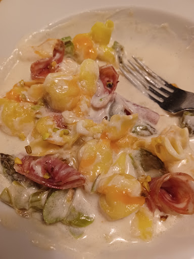 Después pedimos una milanesa de pollo y una lubina. La milanesa seca y sin patatas. El camarero nos dijo que las patatas se habían acabado (ahí comprendimos las "patatas" que nos pusieron en el primer plato) y las sustituyó por una pasta vulgar y corriente. El plato de lubina con un montón de hojas de espinaca tapando unas escasas verduras asadas y el pesto brillando por su ausencia. Nada que ver con la foto que se anuncia en la carta. El postre ni lo quisimos pedir.