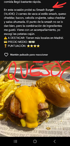 Nosotros probamos: Smash Burger. El aplastado de otros sitios es mucho mayor pero el sabor de la carne está buena🙂 True Trufa🍔 Muy bien, aunque la carne me parece que está demasiado compacta, como dura. La pedí al punto Creo que una hamburguesa por personas está bien 😉