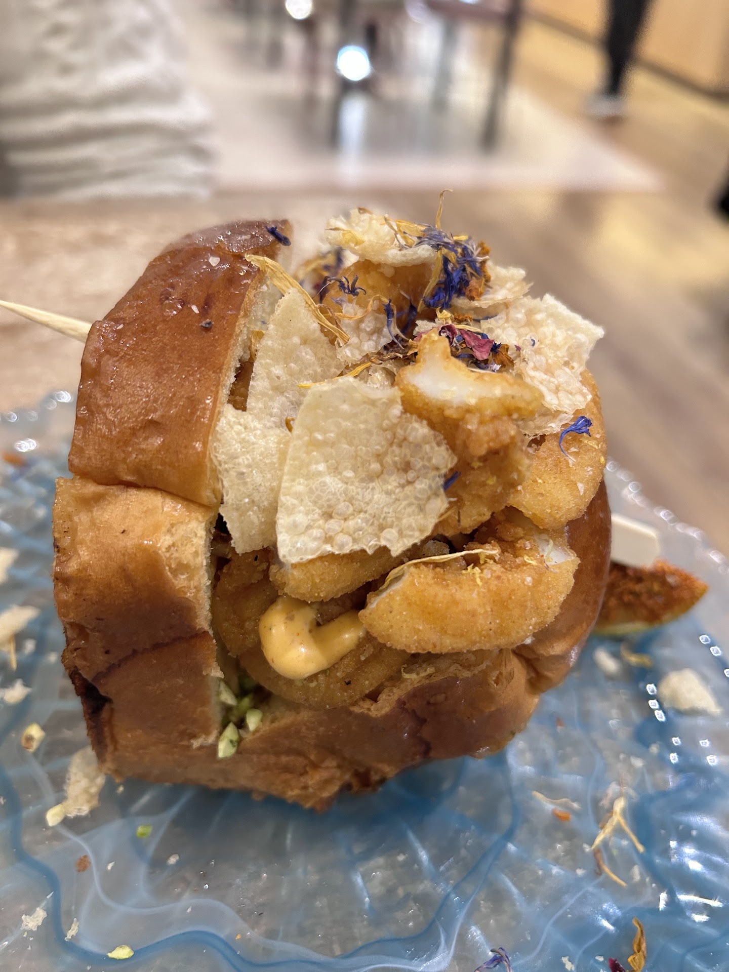 El Michelin (15,9€). Brioche relleno de rabas empanadas, aromatizadas con ralladura de limón, polvo de pistacho tostado con sal de lavanda, salsa japo-nikkei, virutas de torreznos crujientes, fideos de arroz inflado y puntitos de pomada gallega. {2ud}. Plato espectacular, notas un sabor diferente en cada bocado, me encantó. ⭐️⭐️⭐️⭐️⭐️(🌟).