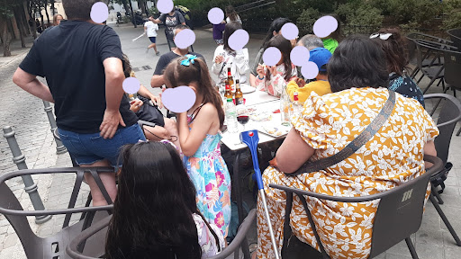 He puesto 1 estrella porque no me deja poner menos. Esto ha sido un insulto. Eramos 10 adultos con 1 o 2 niños respectivamente ( un total de 13 niños y los 10 adultos). Cuando hemos llegado a la terraza hemos unido 3 mesas y el señor de gafas ha venido muy molesto que por qué hemos unido 3 mesas, que con 2 mesas es suficiente porque no quedan mesas para otros clientes (quiero mencionar aquí que habían otros 4 mesas libres y al lado nuestro habían sólo 4 adultos con 2 mesas unidas usando las otras sillas para mochilas). Le hemos pedido por favor, porque los niños seguramente van a querer comer y no ha querido. Ha retirado de malas maneras la tercera mesa y ha dejado sólo dos. Mientras tanto el camarero había empezado a servir bebidas a los adultos y no me quedó otra que quedarme con el grupo. Al poco tiempo, los niños han empezado a pedir comida. Aquí quiero hacer especial énfasis en el sándwich mixto, que no era sándwich mixto, era una especie de medio-bocata con una loncha de jamón York y una loncha de queso en pan de chapata duro. Fatal. Y encima carísimo, tanto la bebida como la comida. A todo esto, tuve que estar de pie para que mi hija se pueda sentar para comer, que comida dejo más de la mitad porque el sándwich no era bueno. Y no fui la única madre (como se aprecia en la foto) que estuvo de pie para que su hijo/a pudiera sentarse a comer o que tuvo que compartir silla con su respectiva hijo/a. Es que esto es inadmisible. Cuando mi hija quiso entrar al baño, el señor de gafas nos miró feo. Aún así entre. Os parece normal que estando en 2024, un baño esté en éstas condiciones??? ( Se aprecia en las fotos). Yo porque no sabía cómo es, pero otros padres, al verlo, no dejaron que sus hijos vayan a usar ese baño. Pongo ésta reseña para que otras personas que la ven se lo piensen 2 veces antes de ir a esa terraza. Porque ni yo, ni ninguna persona de mi grupo no vamos a volver allí, seguro. Una total falta de respeto al cliente, para no mencionar ya otras cosas. 100% NO...