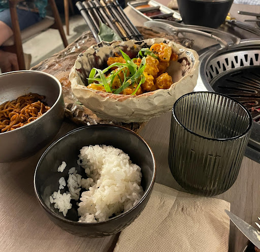 Read moreLa verdad que viendo las reseñas que han puesto no te puedes imaginar encontrarte con semejante desatino, me parece que estamos perdiendo el gusto por la buena comida y más aún, por la buena carne. Nada mas entrar, muy amablemente te indican cual es el método. Nos decantamos por el buffet sin bebidas pues no tenían ningún tipo de coctel sin alcohol. Un fallo. En cuestión de minutos te llenan la mesa de pequeños cuencos (acompañamientos) que sorprenden y dejan mucho que desear, tales como arroz, fideos, pico de gallo, coles, patatas fritas, ensalada de verdeo y manzana, totitas de maíz, una Parmentier 5 especias que no sabe a nada, en fin, irrisorias, secas y escasitas, ya que, con un par de probadas, acabas con los acompañamientos. Te indican que pidas el entrante (uno por persona) y ponen la parrilla en marcha. No habían llegado los entrantes y se presentan con un plato de brochetas que lleva tres dados de pollo, tres de panceta y tres tiras cocinas que ellos llaman aguja. Acompañadas de otras tres (me lo voy a jugar el numero a la lotería) lascas de champiñón verde que son minúsculas. Por cierto, siguen sin aparecer los entrantes. Llega la tan esperada carne, un inciso, el fabuloso Wagyu A5 esta agotado. Según ellos 100gr por persona, si te pones a verlo realmente no es mucho, un huevo de gallina promedio pesa alrededor de 60 gramos. La chica se esmera en poner en la parrilla dos cortes, dos minis Burger, dos chorizos y nos sugiere sutilmente que la carne hay que comerla poco hecha, y siguen sin llegar los entrantes, volvemos a recordárselo. Muy de vez en cuando pasa a ver como esta de llena la parrilla, por cierto, la carne no sabía a nada, daba igual que pusiera el corte que fuera, no notabas ninguna diferencia. Me olvide, casi al final llegan los tan esperados entrantes, Langostinos tigre con salsa ahumada mayo kimchi y Burrata fresca con base de rúcula, salsa de pesto asiático y 2 tomate Cherry. Los langostinos gomosos, duros, fríos por supuesto incomibles. La Burrata era mas bien pesto con Burrata, tenia tanto pesto encima que no se veía la burrata, por cierto, reseca, una buena burrata debe desparramarse sobre el plato si la cortamos. He visto muchas reseñas donde la gente se queja que piden menú para cuatro y sirven menú para dos. Lamento la mala experiencia, el tiempo perdido y el dinero. No vengan, me lo van...