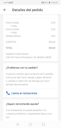 Read moreMi pareja ha realizado un pedido y el repartidor ha llegado con 20 minutos de retraso sobre la hora de llegada estimada. Al comprobar el pedido faltaba una ración de patatas, la cual llamamos por teléfono para reclamarla y nos dijeron que en 5 minutos la recibíamos con el repartidor. Escribo esta reseña tras 1 hora de espera, obviamente no hemos recibido las patatas, ni siquiera una llamada de disculpa o la devolución de esos 4€ que valen las patatas, es decir... esta establecimiento nos ha robado 4€. La carne estaba buena, pero de las patatas incluídas en mi plato, la mitad estaban durísimas, excesivamente fritas. No volveremos a pedir a este "establecimiento" y sin ninguna duda, NO...