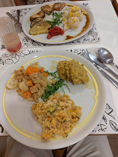 Read moreLe pongo 1 estrella porque no se puede poner ''0''. Fuimos a cenar un sábado mi familia y yo por primera vez. Por los comentarios, las fotos y las valoraciones, tenía muy buena pinta. Nuestra sorpresa fue cuando llegamos ahí. Nada más lejos de la realidad. El restaurante es muy pequeño y tremendamente descuidado, sinceramente, a mi me pareció estar bastante sucio y todo viejo y muy usado. Para nada agradable de estar ahí. Las mesas pegadas unas a otras, para sentarte tienes que molestar a los otros comensales, lo cual es incómodo y desagradable, parece que estás en una comuna y te enteras de todo lo que hablan en la mesa de al lado. Muy incómodo. Las opciones de carta son muy escasas, a penas tienes para elegir. Son súper inflexibles a la hora de combinar platos. Son menús cerrados con un precio fijo. Si te apetece comer sólo uno de los platos del menú, te cobran por el menú entero. Siendo vegetarianos pensaba que serían gente más abierta y aceptarían lo que el cliente quiere. La comida bastante insípida y los platos con muy poca cantidad. Salimos todos con hambre y eso que pagamos casi 25€ por cabeza. Teniendo en cuenta todo esto, me pareció muy muy caro. La camarera ni tan sólo sabía lo que llevaban los platos ni mucho menos explicarnos los ingredientes o el proceso de elaboración. A parte que fueron muy poco amables. Se notaba que tenían ganas de que marchásemos para poder cerrar pronto. Ponen una cantidad de incienso que bastaría para humear la Catedral de Santiago después de la peregrinación. Salimos apestando y tuvimos que dejar la ropa aireándose durante unos días. Y ni hablemos del pelo, me lo tuve que lavar antes de acostarme del pestazo que hacía. A veces vas a sitios y sales oliendo a comida, comprensible. Pero el tufo a incienso no es normal. Luego ves la comida, que no sabe a nada, y entiendes por qué no huele a comida pero sí a incienso. Llevo cinco años siendo vegetariana y probando muchos restaurantes vegetarianos y nunca había estado en uno tan malo. Bueno, y sin ser vegetariana. No había estado nunca en un restaurante de cualquier tipo tan malo. No pienso volver ni lo recomiendo a nadie. Me avergoncé de haber invitado a mi familia a este lugar, francamente. Me sentí estafada y también incrédula por haber hecho caso de las valoraciones buenas. Les pongo un 0 en todo, en atención, en comodidad, en servicio, en limpieza, en iluminación, en el olor del ambiente, en calidad de la comida, en variedad de platos, en sabor, en cantidad,...Ojalá hubiese tomado fotos de los platos para compartirlo aquí ya que las fotos que hay no creo que sean de este lugar y las críticas positivas muchísimo menos. Ni aunque fuera el único restaurante abierto,...