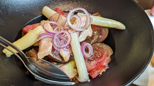 The modest dining room was comfortable, the staff friendly. Of course, we ordered cachopo, but we also ordered a tomato, white asparagus, and tuna salad to start. Although it's not prime season for tomatoes, these were the sweetest we enjoyed on the trip.
