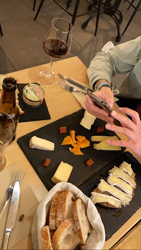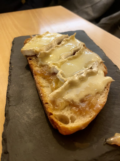 🍛COMIDA: pedimos una cerveza francesa artesana y un vino mientras decidíamos qué comer y nos pusieron una tapa gratis que eran unas olivas. Ya para comer pedimos una tabla francesa para dos personas, que al final son 5 tipos de quesos diferentes, qué el camarero nos explicó de qué tipo eran y nos aconsejó el orden para comerlos y la verdad que estaban bien, al final eso es subjetivo y según lo que le guste a cada uno, pero estaban buenos y sí que son algo diferentes a lo que puedes probar de normal; también pedimos el paté de cerdo con trufa negra y la verda que muy sin más, no notabamos mucho la trufa y fué lo que menos nos gustó; por último pedimos una tosta de queso brie con cebolla caramelizada que estaba BUENÍSIMA, totalmente recomendable, de verdad.