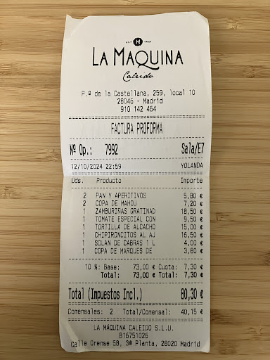 Great first experience, we were celebrating my mother-in-law's birthday and they booked a table at La Máquina Caleido. This place is espectacular; from the ample space to the decoration. Surrounded by floor to ceiling windows, it's light and welcoming. The food is to die for, with vegetarian options (not that much for vegans I'm afraid). For starters we ordered the degustación de croquetas, artichokes and calamares. As mains, we ordered fabada, callos, fried haddock and the vegetarian rice. The food quality was outstanding, the rice (our main dish) was cooked to perfection, but everybody commented for exceptional the food was. And the wine, oh my goodness, if ordering red, please get a bottle of Ramon Bilbao, delicious! I wholeheartedly recommend this place, I'm just so sad I was just visiting Madrid as we live in London. But this will definitely be my place to go to next time we visit my in-laws in Madrid. The service was also outstanding, I cannot thank Mercedes and Michelle enough! They were amazing hosts and made my mother-in-law's birthday one to remember when they arrived with her dessert decorated with a huge sparkle stick. Mercedes, gracias por el abrazo al final de la comida. Nos vemos pronto, prometido. You...