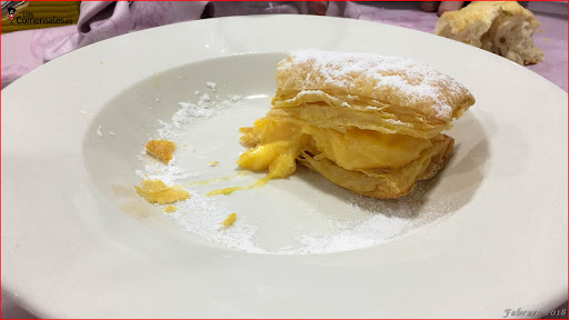 Postres: ─ De ahí pasamos a los postres y que pedimos tarta de queso, milhojas de crema, tarrina de tiramisú y arroz con leche. Para mí el plato ganador con diferencia fue la tarta de queso por lo que al final pedimos una...