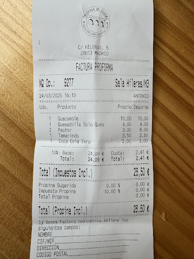 Read moreBeing from Mexico, after a few weeks of enjoying Spain, I just had to have some Mexican food... closest was this one and it was truly dreadful. I wasn’t expecting the real thing but this was absolute slop. The “margaritas” tasted like corn syrup with a splash of lime concentrate - if there was any tequila in there it was on the molecular level only... That being said, there were a lot of people there and they looked quite content, there were even people waiting. So, by all means go if you aren’t that familiar with Mexican food, but for anyone who is, stay away - not one thing there that didn’t come out of a can or a plastic bag.......