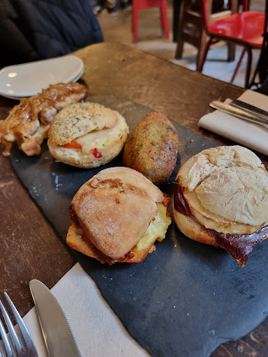 Sobre la enorme barra en forma de U están la mayoría de pinchos de la carta. Los camareros suelen ser bastante majos y te van diciendo que lleva cada uno, ya que algún pincho es difícil de descifrar (nazareno? bambi?). Además tienen una sala comedor, donde creo recordar que tienen menú del día.