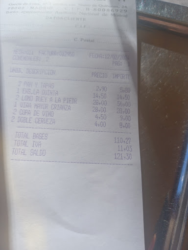 Read moreNo se si leyendo algunas reseñas estoy refiriéndome al mismo lugar. Mi experiencia es en La Quinta en calle García de Luna 1, justo detrás del auditorio. Que Madrid es imposible de caro, que Madrid ha dejado de tener calidad en su comida no puede permitir que el señor de este lugar se permita cobrar desorbitantes precios y sin justificación alguna. Que te diga que no tiene alcachofa con almejas de 18 euros y te proponga sustituir por alcachofa a la plancha con jamón para terminar pagando 30 euros por ellas y no tener jamón, resulta ser un timo. Si además añade 3.50 euros por un aperitivo no solicitado. Si la copa de vino es de a 4.50, la cerveza otro tanto y el postre no casero suma 7.50 acompañado de tisana de 3.50 euros., una se encuentra estafada. Menos mal que el dueño explica que los precios son porque paga a sus camareros a los que increpar delante de los clientes. Ciertamente como el señor ha dicho le quedan meses para no seguir, lo que me pregunto es como ha podido estar todavía aquí con estas...