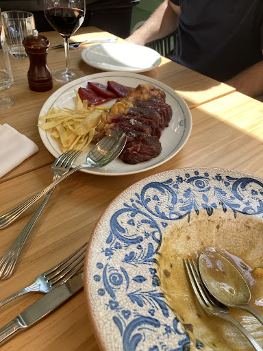 🥙COMIDA: fuimos a comer 4 personas y pedimos todo para compartir. Concretamente pedimos la ensalada de tomate y mozzarella, la cual estaba muy buena y te sirven un aceite muy bueno por si quieres aliñarla más, la recomiendo probar; también pedimos la ensaladilla rusa, la cual estaba un poco sosa, la verdad que es lo que menos me gustó de lo que pedimos, eso si de cantidad estaba muy bien; también pedimos las croquetas de jamón, que serán de las mejores que he probado la verdad, las recomiendo; pedimos también un plato que estaba fuera de carta que eran unas setas con huevo y una espuma de puré de patata, y la verdad que estaba espectacular; y por último, pedimos el lomo alto de vaca trinchado (para dos personas) que lo sirven con patatas y pimientos del piquillo y el cual estaba muy bueno aunque igual le faltaba algo de sabor, pero se notaba que era de calidad.