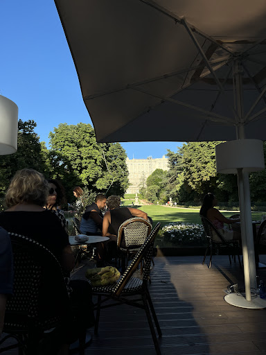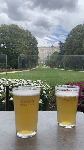 Aprovechamos que Madrid se vacía en verano para conocer esta terraza tan idílica. Tienen unas cuantas mesas en una explanada, al pie de la entrada al parque, desde la que se aprecian unas vistas espectaculares al palacio y los jardines. Hay fundamentalmente mesas bajas y alguna mesa alta. Además, en una zona más escondida, donde se encuentra la barra y la cocina hay alguna mesa alta más. Por las mañanas el sol da de pleno a las mesas y a última hora de la tarde ya hay sombra. Con los árboles la sensación térmica es un par de grados menos, y además, hay difusores de agua en las sombrillas. Parece conveniente ir con reserva, aunque entiendo que está más enfocado a comer o cenar, y no a tomar alguna bebida. Tuvimos suerte y según llegamos, a eso de las 20:15, se liberó una mesa. Para esa hora, había mucho extranjero ya cenando y la verdad que la comida se veía bien. Eso sí, huele bastante a comida, en nuestro caso, a calamares fritos. La carta de bebidas es variada y extensa, con opciones de coctelería. No es barata, pero es menos cara de lo que esperaba. Nosotros pedimos unas cervezas de Mahou y una limonada de violetas. Me sorprendió muchísimo la limonada y la recomiendo un montón. Sin mucha expectativa, pregunté si era muy dulce y me dijeron que el podían ajustar la cantidad de azúcar. Sirven un buen vaso, con la limonada bien fresquita. Abajo se encuentra la parte de violetas, con una consistencia gelatinosa que no se llega a integrar con el resto de la limonada. El conjunto me encantó. Además se veía que la limonada era casera por la pulpa. En general, disfrutamos mucho de la experiencia. Una vez sentados, las vistas no son tan completas porque las sombrillas tapan visibilidad. Dependerá mucho de la mesa en la que te toque. Es una pena porque la gente en general va poco arreglada y desmerece mucho la vista. En cuanto al personal, son muchos y todos están bien coordinados. Fueron rápidos y amables. Salimos a 5€ por...