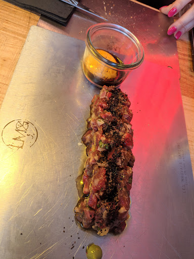 Read moreUn local alternativo en pleno barrio de Malasaña con un chef francés super cool, ¿qué puede salir mal? Pues bastantes cosas. A pesar de que el chef fue bastante atento con nosotros, no puedo poner una valoración mejor a este sitio. Sin ni siquiera pisar el restaurante, ya teniamos que haber que pagado 10€ por persona anticipadamente para reservar la mesa, y haber pedido los platos con 24 h de antelación. 24 h de antelación para pedir unos platos de poca o escasa elaboración, donde todos los platos son cosas crudas o a la plancha, siendo el más elaborado de la carta una hamburguesa con queso de cabra del super más cercano. Una vez llegado al restaurante, el chef nos sacó los 3 tipos de vino que tiene, bajo el pretexto de "no te puedo aconsejar qué vino marida mejor con cada plato, porque en mi opinión el maridaje es un concepto anticuado". Vinos, que por mucho que el chef remarque hasta la saciedad con su exquisito acento francés que "son vinos distintos, son los vinos que a mi me gustan", no dejan de ser vinos bastante del montón. En cuanto a la comida, para empezar, absolutamente todos los platos que pedimos estaban frios. Nos sirvieron para picotear unos cachitos de "pan ecologico" más dificil de tragar que la ultima temporada de juego de tronos, con mantequilla, los cuales, por supuesto, nos los cobraron. De entrantes, pedimos un queso camembert que aunque debería llegar caliente, nos lo dieron recien salido del frigo por el modico precio de 21€. Eramos una mesa grande, por lo que pudimos probar varios de los platos principales de la carta con resultados variados: si bien el tataki de solomillo esta bien aderezado, la hamburguesa de confit de pato estaba a la altura del pan ecologico: más seca que un dia sin agua. La envuelves entre dos brioches, un cachito de lechuga, rulito de cabra, dos pepinillos agridulces y listo, 16 euros de hamburguesa, a facturar. Aunque algunas venían frías y otras quemadas, las patatas de acompañamiento que se salvaban, sí que estaban bastante buenas. Una lástima que ni siquiera se dignasen a poner uno de los vasitos minusculos en los que venían a cada comensal, por lo que tuvimos que repartir 3 vasitos entre 5 personas. Pero sin duda el plato estrella de la noche fue el wok de verduras, recien salidas de la huerta. Estaban tan frescas que no les debió dar tiempo ni a pasarlas por una parrilla, y mucho menos a echarles sal o algún tipo de aderezo. He visto a gente llorar por menos que por tener que acabarse ese bol. Indigestión asegurada por tan solo 12 lereles. Por último, el postre, la nouvelle cuisine, la inolvidable experiencia de "chocolate". Entrecomillo chocolate, porque, surprise! no hubo un ápice de chocolate. No voy a desvelar en qué consistió, porque el chef nos pidió que guardaramos el secreto. Lo único que puedo decir es que la higiene y las medidas covid no son precisamente tenidas en cuenta, y que desde luego, si te quedaste con hambre con la cena (algo bastante probable teniendo en cuenta el tamaño raquítico de los platos), no esperes saciarte con el postre. El staff al menos si fue muy agradable, y nos dió un trato excelente. En definitiva una decepción absoluta de sitio, cuya alta valoración en las reviews solo se comprende debido al incríble número de gente moderna cuya única expectativa en la vida es aparentar ser más chic y alternativo que Mario Vaquerizo. Pagarían 30€ por una Whopper si se la envuelven en papel rosa y le ponen un bonito nombre en...