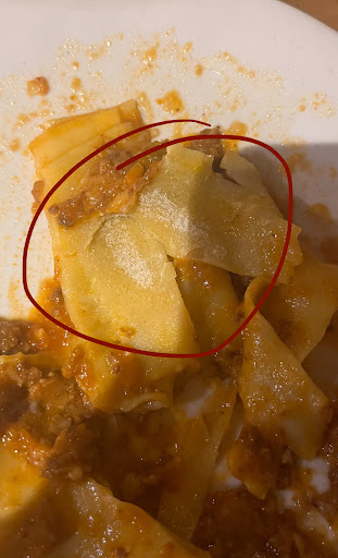 For our mains, we ordered a mediocre bolognese and a devastating amatricciana that was a completely different dish than the one you’d expect. Instead of crispy guanciale, you get braised pork. And instead of a silky emulsified sauce, you get a slow-braised pork/tomato dish with undissolved pecorino. The bolognese tasted ok, but only by comparison to rest of this miserable meal, even though the fresh-made pappardelle had noodles that were undercooked and glued together.