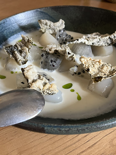 We went last night for dinner service. The food was delicious except for the meat dish on the hot menu. It was too charred for us and tasted burnt on the outside. The piece of meet they served us was also quite fatty so it was not pleasant to eat. The secreto bite was also a fatty piece of meat. The rest of the dishes we ate were quite delicious. The viera and cabbage were highlights. Mochi was tasty but wish it wasn’t so cold. I found the Urta to be quite dry although I don’t know if the fish is meant to be that way. The cocktails were also delicious. What was most lacking for us was the ambiance. Half the plates they served us with were cracked. It was so dark we had to use our flashlights to be able to see what we we’re eating. There is no sound absorption in the place so I had to raise my voice and try very hard to listen to who I was eating with. The service was acceptable for the price you pay but nothing out of the ordinary. We were pressured at the end to leave our table even though we arrived on time to our reservation and were suggested to order 10 plates. Do not pressure your guests. Sometimes there were gaps of time between plates, do not pressure your guests if it is not their fault their table took a long time. In my opinion the place is not worth the hype of 85 euros per person. Plenty of other restaurants in Madrid are a better experience for the price and you don’t leave with a headache or pressured to...