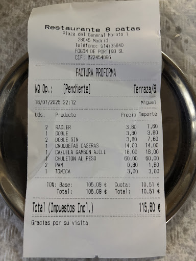 21€ por persona con dos bebidas salimos y sin comer apenas. Pidiendo 6 raciones para 8 contando y esperando como es normal que por 35€ de fritura...